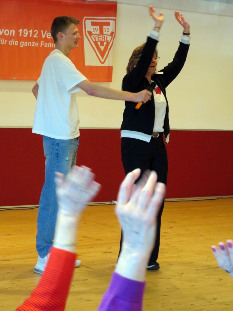 Übungsleiterin Sabine Metzger-Klokkers brachte Bewegung in den Saal. Beim Sitztanz gingen die Hände hoch und runter, die Füße stampften mit, alle waren mit großem Eifer und Einsatz dabei. Als Sabine dann einen Kanon aus dem Tanz machte, wurde es allerdings etwas kompliziert und nicht mehr alle konnten den Ryhtmus halten….